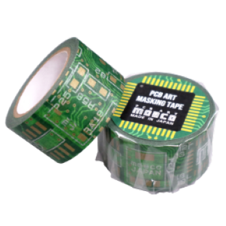 基板を緻密に再現した、貼っても眺めても楽しいマスキングテープです。 製造は「mt」などで有名なカモ井加工紙株式会社で行っており、日本製です。 和紙で印刷可能な最小線幅に挑戦しています。メッキ部分は金インクを使用しており、光が当たると上品に反射します。 リピートデザインのため、どの部分でテープを切っても絵柄が途切れません。 一般的なマスキングテープの幅より太めのサイズで作っており、貼り付けると迫力を感じられます。