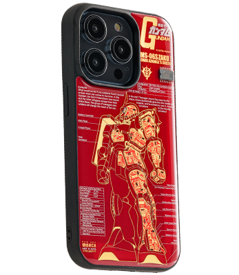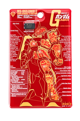 シャア専用ザク 基板アートiPhoneケースでは、モノアイに実装したLEDが通常時は光らず、iPhoneが発する強い電波をキャッチし、昇圧回路で電圧と電流を高めて電池無しで光ります。