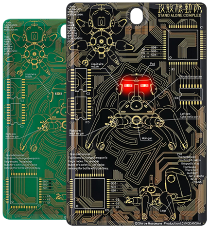 基板の配線パターンなど約19万ラインで「タチコマ」を精巧に描写。電子部品を合計15個実装し、改札のタッチやICカードでの決済時に電池無しでLEDが光るギミック付き。タチコマデザインではポッド部分に実装した2か所の赤色LEDが光ります。