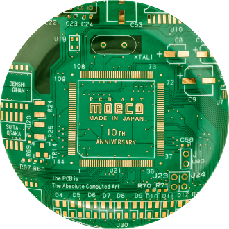 美濃焼の窯元と協力し、基板の表現に細部までこだわった基板アート豆皿です。 メッキ部分には含有率92%の本金を使用しており、光が当たると本物の基板のように美しく反射します。 配線やシルクのラインは最小線幅0.16mmとなっており、途切れなくはっきりと視認できる限界に挑戦しています。 縁いっぱいまで色を載せ、基板がそのままお皿になったような仕上がりで食卓を彩ります。